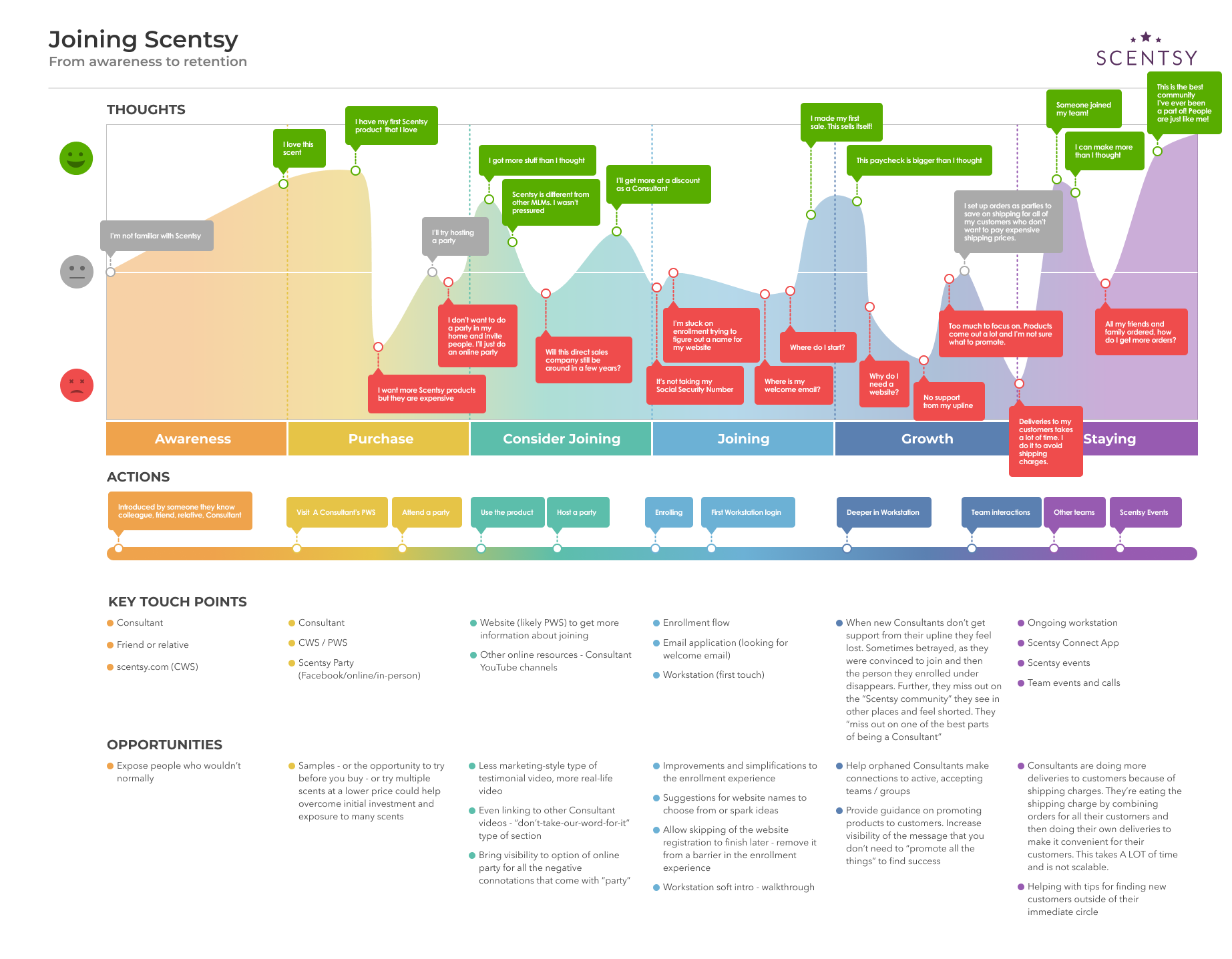 Starting with initial thoughts and internal beliefs I created a rough journey map as a starting point. Incorporating interviews and focus groups I was able to add, delete, and change touchpoints and thought processes of customers who wished to join Scentsy as Consultants. Digging further I was able to uncover some opportunities from the largest pain points and the company was able to adjust the program to ease those pain points.