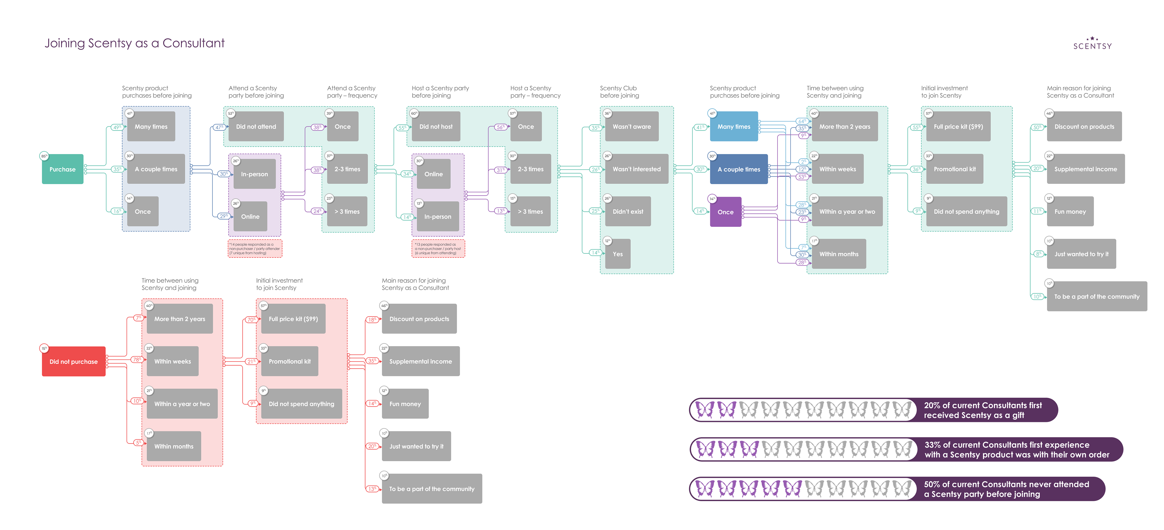 Further exploring through surveys I was able to map out a journey of a typical customer looking to join Scentsy. Although the map was complex it helped to clarify and challenge the internal belief of what the "typical journey" of a customer looking to join Scentsy actually looks like.