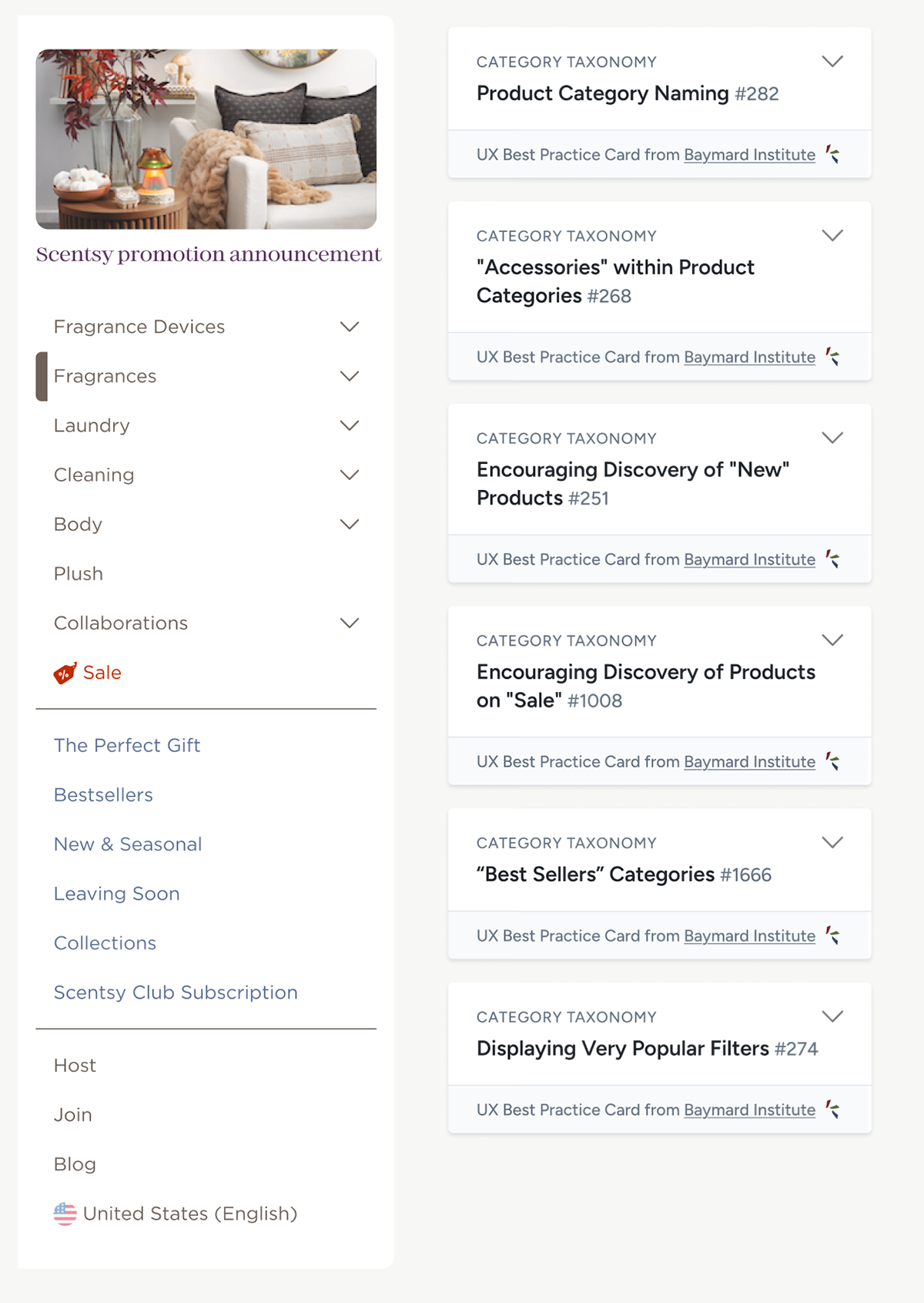 Using a combination of Scentsy specific usability research and Baymard's e-commerce guidelines I explored Scentsy's category taxonomy and navigation experience. I presented a list of risks and mitigations for each solution and provided "Guiding principles" to help present the solution. This gave us the opportunity to solve the scalability issue while addressing a problematic experience shown through usability testing stemming from the different experience with the accessory navigation between mobile and desktop.