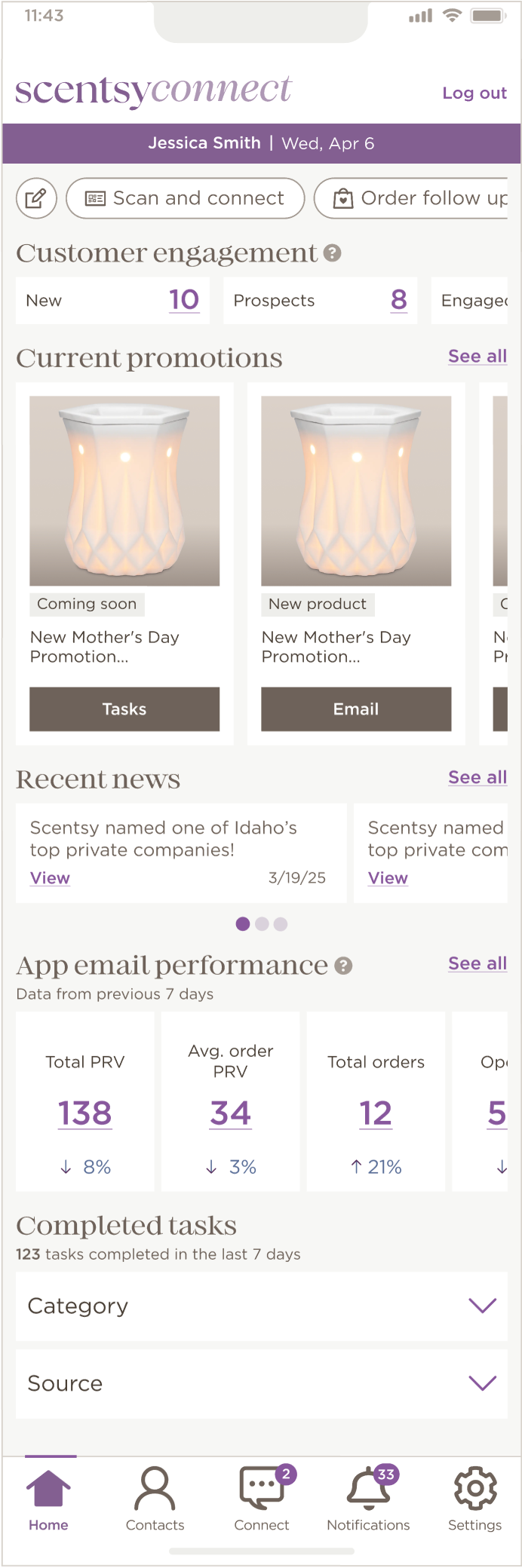Scentsy Connect is designed to help Scentsy Consultants build deeper, more meaningful connections with their customers. By leveraging purchase history, behavior patterns, and product affinities, the app surfaces actionable insights and makes it effortless for Consultants to reach out, resulting in more personalized experiences and stronger sales relationships.